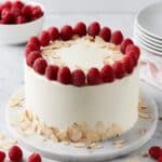 Keywords: raspberry cake, almond cake, buttercream frosting, Swiss meringue buttercream, raspberry filling, layered cake, berry dessert