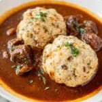 The image shows a close-up of a white plate with two large, round dumplings that have a rough texture and visible bits of herbs and onions inside. They are placed on top of a thick, brown stew with chunks of beef and a rich, glossy sauce that slightly spreads around the dumplings. Some small green herb leaves are scattered on the dumplings and in the stew, adding a touch of color contrast. The plate is set on a white marbled surface. photo taken with an iphone --ar 4:5 --v 7