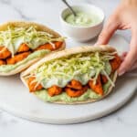 Two soft pita breads are filled with bright orange grilled chicken pieces layered underneath a thick, creamy green sauce and topped with finely shredded white cabbage. The pitas are slightly opened to show the colorful filling inside, resting on a white marbled surface. A small white bowl with more sauce is placed nearby, and a woman's hand is reaching toward the pita on the right. The textures show the crispness of the cabbage and the juicy grilled chicken, with the smooth sauce drizzled over the top. Photo taken with an iphone --ar 4:5 --v 7