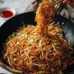 This Soy Sauce Pan Fried Noodles recipe features crispy, golden noodles stir-fried with a savory blend of light soy sauce, vegetarian oyster sauce, and Shaoxing wine. Tossed with fresh green onions and crunchy bean sprouts, this dish offers a perfect balance of texture and flavor. Quick and easy to prepare, it makes a delicious main or side dish complemented beautifully by optional homemade chili oil for a spicy kick.