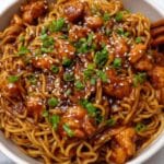 Sticky Garlic Noodles are a flavorful and satisfying dish perfect for a quick weeknight dinner. Tender chicken pieces are coated in a sweet and savory garlic sauce, tossed with noodles, and garnished with fresh green onions and sesame seeds. This recipe is simple to make and sure to become a family favorite.
