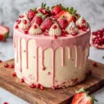 This elegant Strawberry Champagne Cake combines a light, fluffy cake infused with champagne and a luscious strawberry buttercream frosting. Perfect for special occasions, this recipe layers moist cake with rich, fruity frosting and is beautifully garnished with fresh strawberries, pomegranate seeds, and edible flowers for a stunning presentation.