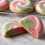 4. Shape and Marble the Cookies (Spiral Method): Roll each colored dough portion into ropes about 3 inches long. Lay the ropes side by side—green, pink, and white—and twist them together once. Coil the twisted ropes like a cinnamon roll and press into a circle shape. Flatten slightly to hold the shape for baking.