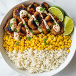 Keywords: street corn chicken bowls, chicken and rice bowl, Mexican chicken bowl, charred corn, lime crema, easy chicken dinner