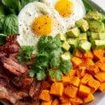 Keywords: sweet potato breakfast bowl, roasted sweet potatoes, bacon breakfast, healthy breakfast bowl, savory breakfast, easy breakfast recipe