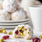 Delightfully tender and lightly sweet tea cookies studded with vibrant dried cranberries and crunchy pistachios, dusted generously with confectioners sugar for a perfect balance of flavors and textures. These classic cookies are baked low and slow for a delicate crumb, making them ideal for afternoon tea or as a festive treat.