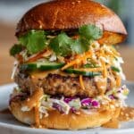 - Assemble Burgers: Spread a portion of the peanut sauce on the bottom half of each toasted bun. Place one cooked turkey patty on top, drizzle with more peanut sauce, then layer with shredded carrot, cucumber slices, fresh cilantro leaves, and red onion slices before covering with the top bun.