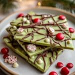 The image shows three irregular-shaped pieces of green chocolate bark stacked slightly on a white plate with a beige rim. The green top layer is smooth and decorated with thin, dark brown chocolate drizzle lines crisscrossing over the surface. Red round candies and small round white and red speckled bits are scattered on top. There are also a few white chocolate drops and small chunks of milk chocolate scattered on the bark. Some red candies are also placed on the white marbled surface around the plate, with soft warm lights and some green pine branches in the blurred background. Photo taken with an iphone --ar 4:5 --v 7