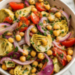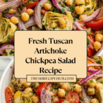 A vibrant and refreshing Tuscan Artichoke Tomato Salad featuring marinated artichoke hearts, cherry tomatoes, chickpeas, and fresh herbs, all tossed in a zesty red wine vinaigrette. Perfect as a light lunch or a flavorful side dish.