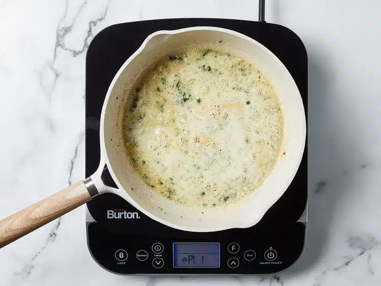 - Make the Cream Sauce: Pour in the heavy cream and chicken broth, stirring well to combine. Bring the mixture to a gentle simmer and cook for 3-4 minutes to allow the sauce to slightly thicken.