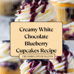 These White Chocolate Blueberry Cupcakes are moist and fluffy treats bursting with fresh blueberries and smooth white chocolate flavor. Topped with a creamy white chocolate buttercream frosting and garnished with fresh blueberries, they make a perfect dessert for any occasion.