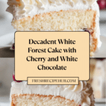 This White Forest Celebration Cake is a luscious, multi-layered dessert featuring tender vanilla cake layers soaked with cherry syrup, filled and topped with fluffy whipped cream, fresh cherries, and white chocolate shavings. Perfect for special occasions, this cake combines the sweetness of cherries and cream with the delicate richness of white chocolate for an elegant and festive treat.